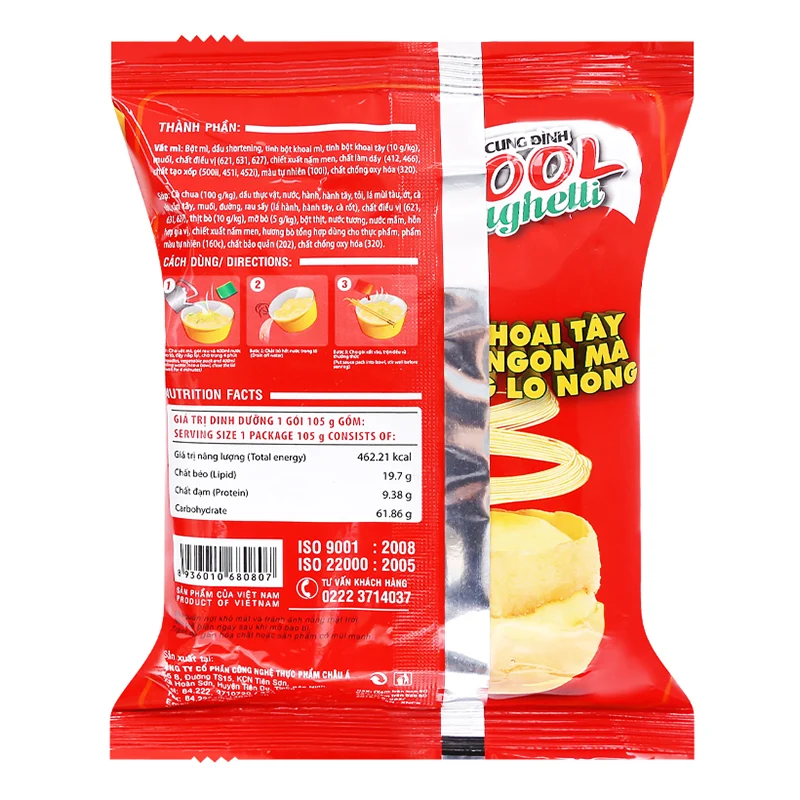 SAUCE – Fresh tomatoes (100 g/kg), water, vegetable oil, onions, garlic, coriander leaves, chili, carrots, celery, salt, sugar, flavor enhancer (621, 631, 627), minced beef (10 g/kg), beef fat (5 g/kg), soy sauce, fish sauce, spice mixture (onion powder, garlic powder, pepper powder, chili powder), yeast extract, synthetic beef flavor for food, preservative (202), antioxidant (320).