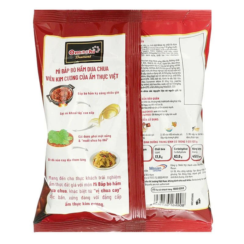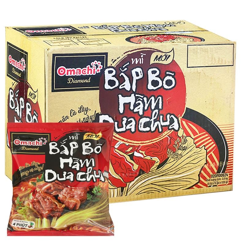 Omachi noodles with braised beef and pickled cabbage flavor with main ingredients including noodles made from potatoes, seasoning packet, beef stew broth packet, and Tam Diep pickles, spicy and aromatic ground pickles. When enjoying, the golden, chewy potato noodles blend with the sourness of pickles, a little spiciness from stir-fried red peppers and the sweet broth from beef stewed for many hours. All create an irresistible “spicy and sour flavor”.